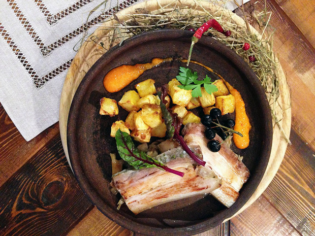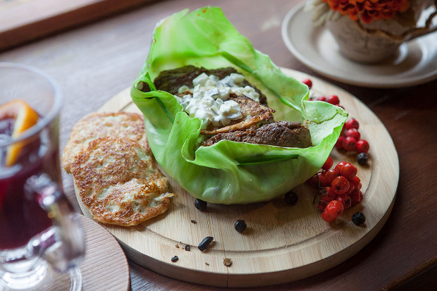 Придуманный «Красной избой» гастрономический фестиваль проводится каждую осень уже пять лет. Цель простая: популяризация новгородской кухни. Благодаря ему в заведении с французской кухней появляется тяпаная говядина, в ресторане гостиницы из крупной международной сети — серые щи, а в грузинском кафе — тельное из судака. Ну а в местах с русской кухней — новые интересные блюда. А еще устраивают конкурсы, которые помогают находить интересные полузабытые рецепты. И проводят в ресторанах дни разных национальных кухонь — эстонской, сербской, швейцарской, чилийской. В общем, делают многое для того, чтобы новгородцам и туристам не было в городе в смысле еды скучно. Вот одно из фестивальных блюд, снятых нами на крыше гостиницы «Россия».