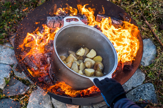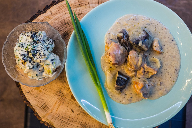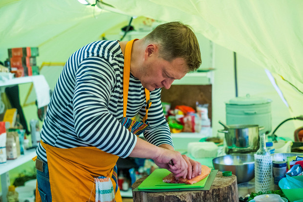 Мне есть совсем не хочется, таким плотным был обед. Но тут Шмаков выносит первое блюдо. Севиче из маринованной в морской воде семги с соусом из морошки, водки, красной икры, с печенным с водорослями луком и соленым огурцом. Свежесть, море на языке, легкая кислинка — все сбалансировано и ненавязчиво настолько, что не замечаю, как моя порция улетает. Хочется продолжения, тянусь за второй. На горячее кролик, тушенный с грибами, и картофель в мундире, жаренный на костре, с соусом из плавленого сырка «Дружба», мускатным орехом и зеленью. Морошку и грибы Шмаков нашел с утра на Мустатунтури, икру и специи привез с собой, за кроликом и сырком устроил набег на холодильник. А семгу поймал Сергей Глухов за пару дней до экспедиции.