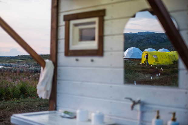 «В драй-бэги можно запаковать свои рюкзаки, и они не промокнут, а еще их можно надуть и использовать в качестве спасательных жилетов, если вы вдруг окажетесь в воде. Так, дальше у нас космическое одеяло! Им можно накрыться от дождя или же от ветра. Незаменимая вещь в тундре», — консультант лагеря по вопросам выживания Олег Гегельский представляет наборы, которые получили все участники экспедиции. Про то, как выжить в дикой природе, он может говорить часами, и даже тут, в очень комфортабельном полевом лагере, он построил себе укрытие из камней и спит на свежем воздухе у костра. Также с нами в команде врач, механик, повар. Ответы на вопросы возникают раньше, чем сами вопросы: это называется превосходная организация. Питьевая вода — из источника, в бане — из ручья и горячая! В общем шатре — бар, диваны, книги, телевизор и настольные игры. Шеф московского ресторана «Горыныч» Артем Лосев и Георгий Троян садятся за нарды, пока есть короткая передышка после завтрака.