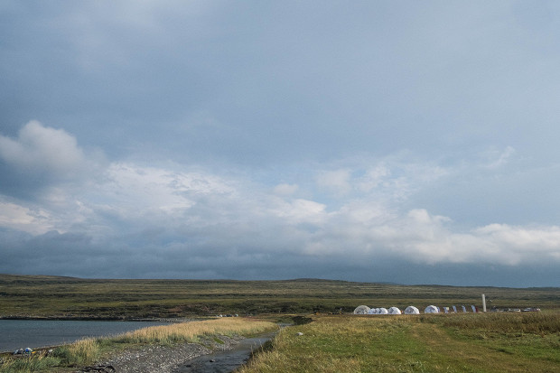 В какой-то момент деревьев становится все меньше, а пейзаж превращается в монотонно-прекрасную цепочку из скалистых холмов и озер. Наконец выезжаем на перешеек между материком и полуостровом Средний: здесь, на берегу Малой Волоковой губы, разбит лагерь Mamont Camp. Баренцево море встречает нас ярким закатом: розовая полоса разрезает темно-синее небо и через 10 минут исчезает. Впрочем, на улице светло до часа ночи, таково оно — северное лето.