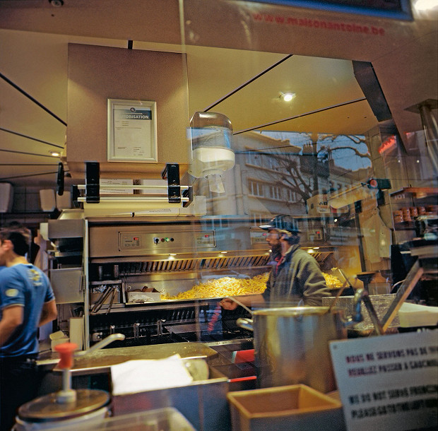 Помню, однажды парень по имени Джефф Хэррис — англичанин, наблюдающий в Брюсселе за евронацизмом, про который он писал книги, — потащил меня на ланч на площадь Журдан. «Популярное место», — сказал он. Я поверил, когда на подступах он раскланялся с дюжиной чиновников Европарламента (евробюрократы, как и геи, в выборе осечек не делают). На площади произрастала унылая круглая постройка — в Ленинграде такими метили конечные остановки трамваев. Мы подошли. Остановка называлась Maison Antoine и торговала фритами навынос. Подле, блаженно-счастливые, фритами объедались семейные матроны и поклонники промискуитета, депутаты и гастарбайтеры, коренные и понаехавшие — единая, черт побери, Европа!..
