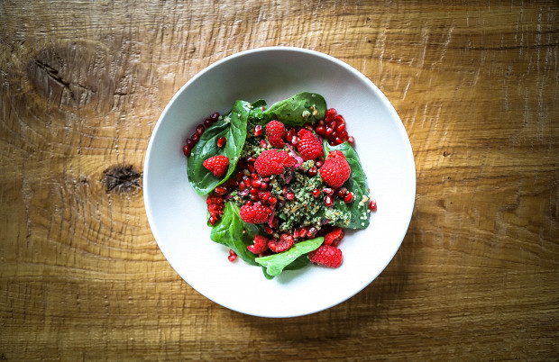 За витамины и свежесть тут отвечают шпинат, маринованный красный лук, гранат, малина и цитрусовая заправка. Малина появилась случайно, это и без нее был вполне самодостаточный салат. Но вот пришло в голову, что нужны ягоды. Даже побоялся сначала, что выйдет полная фигня, но оказалось, что фруктовые нотки малины очень хорошо оттеняют вкус крупы и дополняют вкус цитрусовой заправки. Так что малина тут не для украшения, она очень нужна.