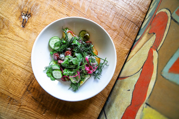 «Горынычем» называют не только само место, но и гигантскую глазастую круглую печь, привезенную из Италии: в ней Лосев пока выпекает только картофельные лепешки и пиццу, но скоро разработает для нее специальное меню. Кроме того, в ресторане выпекают свой хлеб на разных хитрых заквасках, жарят стейки (и парят их липовыми вениками), варят борщ с пастрами, запекают картофель с копченым угрем.