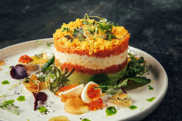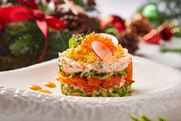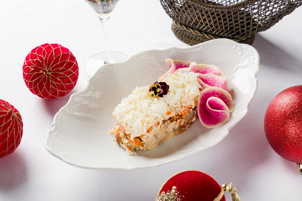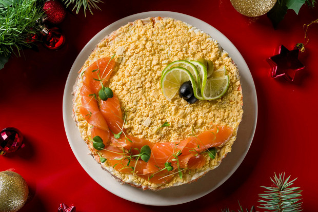 Вариант мимозы от Сергея Артамонова, шеф-повара ресторана «Черетто Море», очень похож на классический, но чуть более современный и интересный по вкусу. Вместо консервированной горбуши в этой мимозе присутствует копчёная красная рыба, и от перемены мест слагаемых гамма вкусов очень выигрывает. В остальном всё просто: рыба должна быть нежной и сочной, картофель сварен аккуратно и не разваливаться. Заменой сибулету может стать обычный зелёный лук — он сразу оживит и освежит привычный состав. А вдобавок для новогоднего настроения можно нахлобучить на верхушку салата ложку красной игры.