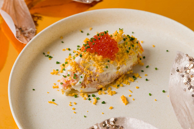 Итальянский вариант мимозы от Доменико Филиппоне, шеф-повара ресторанов-яхт «Чайка» и «Ласточка». Вроде бы слои на месте, но внутри все ингредиенты поменялись местами. Морковь здесь смешана с тёртым авокадо, сырный слой — это сливочный сыр креметте с натуральным крабовым мясом и тобико, а украшение — из редиски и икры. Самое привычное — соус, где майонез замешан с йогуртом, — такой способ сгладить излишнюю майонезность салата мы уже освоили. В общем, исполнение совершенно роскошное, и, если хотите пустить гостям пыль в глаза, повторяйте рецепт точь-в-точь. Но, если заменить натурального краба на крабовые палочки, вкус, стиль и смысл салата не сильно изменятся, а роскошь станет заметно доступнее.