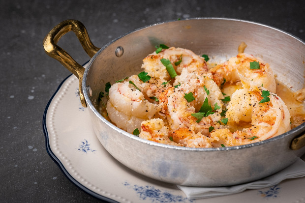 Рецепт от Руслана Полякова, шеф-повара Remy Kitchen Bakery, настолько простой и домашний, что, кажется, мало подходит под категорию ресторанных блюд. Но это как раз тот случай, когда краткость — сестра таланта. На самом деле удивляет в этом блюде все: и то, как креветки ловко ладят со сладковатым пармезаном, и то, как деликатно хрустят под чесночной корочкой. А еще они будут эффектно шкворчать, если подать их не на тарелке, а в порционной чугунной сковородочке, предварительно прогретой пару минут на плите, вместе с ломтем хрустящего хлеба. И пива к ним — обязательно.