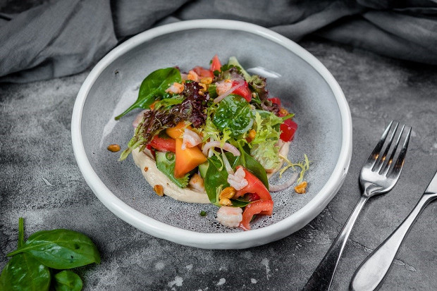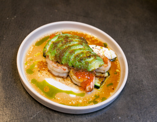 Быстрый рецепт от Григория Чунихина, шеф-повара ресторана Cutfish, выигрывает за счет необычного подбора ингредиентов. Креветки, авокадо, йогурт, обжаренные на гриле тонкие ломтики цукини — на первый взгляд такое сочетание кажется почти диетическим, но соевый соус и красная икра превращают его в праздничное. Нейтральная маслянистая мякоть авокадо вбирает в себя соленость заправки, хрустящие цукини похрустывают корочкой, креветки источают сок, а нейтральный йогурт собирает все вкусы воедино.