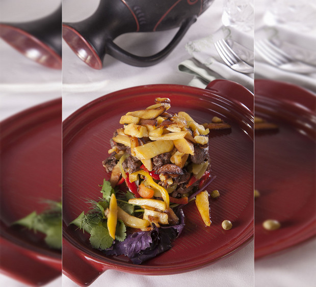 В переводе с армянского «кер-у-сус» — «ешь и молчи». Сытная горячая закуска: обжаренная говядина с овощами и картофелем, приправленная перцем — в Армении обильно, а в нашем случае по вкусу.