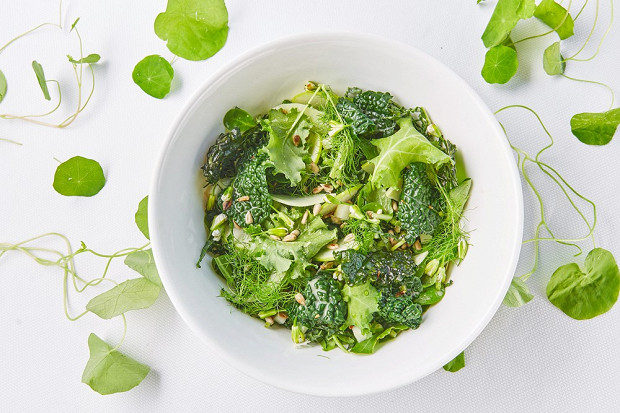 В ресторане «КМ20» шеф-повар Александр Штепа собирает зеленый салат из вороха шпината, брокколи и кейла. Для сытности добавлены авокадо и арахисовая паста, а вкус усложняют обжаренные в соусе терияки ломтики кабачка, создавая иллюзию присутствия в сугубо вегетарианском салате чего-то мясного.