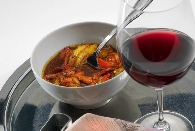 Этот салат сам Марко называет «филе перца». Филе в переводе с итальянского значит «нитки», а печеные перцы тут надо разобрать на тонкие полоски-ниточки.