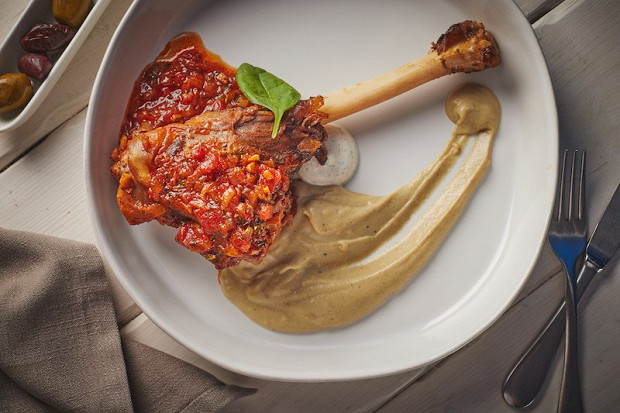 Арни — традиционное греческое блюдо, доведенное нашим бренд-шефом если не до идеала, то точно до высокой точки как с эстетической точки зрения, так и с вкусовой стороны. Для него лучше брать совсем молодого барашка.