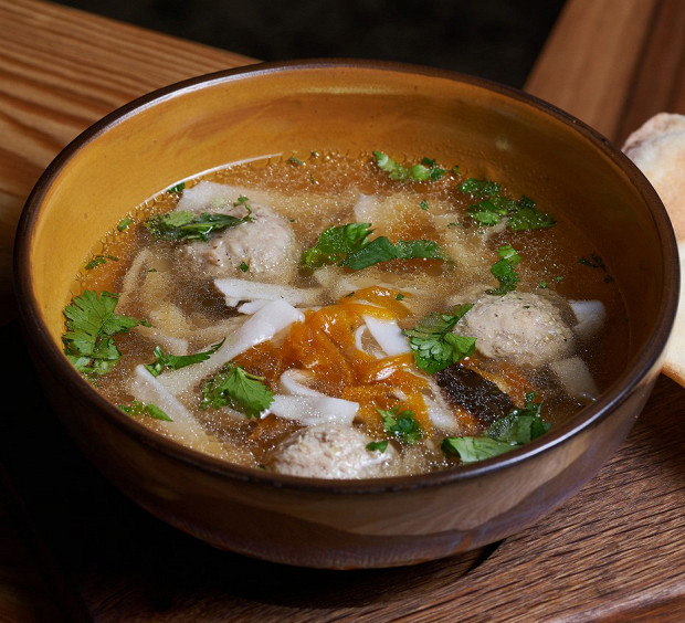 «Когда мы вспоминаем детство, нам часто приходят на ум домашние обеды, рецепты которых передаются из поколения в поколение. Этот суп точно из таких, причем, как мне кажется, любому человеку, вне зависимости от того, где он родился, именно куриный суп дает чувство тепла и безопасности, с ним он везде чувствует себя как дома. Этот рецепт даже не пришлось адаптировать под ресторанный формат: наваристый бульон, лапша, куриные фрикадельки — что может быть лучше? Разве что щепотка хмели-сунели, которая придает супу грузинский характер. Очень удобно наварить сразу много бульона, отдельно наделать фрикаделек, а потом просто соединить на плите одно с другим — так приготовление настоящего домашнего супа займет от силы полчаса».