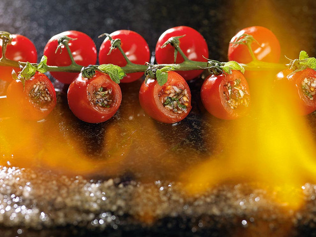 Нестрашно, если при сервировке огонь перекинется на помидоры: чуть обожженными они даже вкуснее.