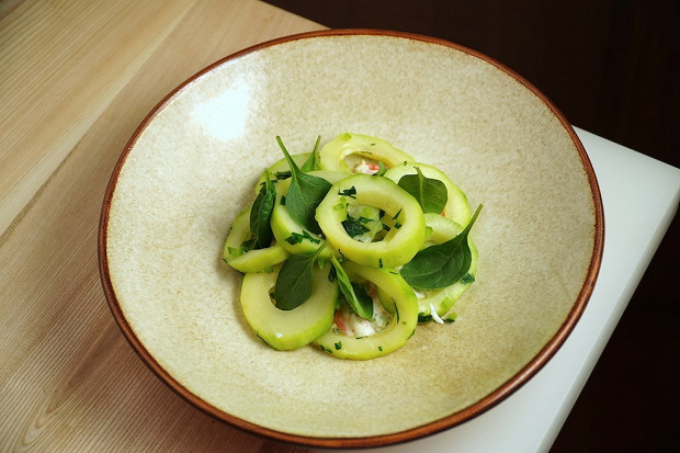 Самый трудоемкий момент в этом салате — соус. Чтобы его приготовить, вам придется потратить целых 3 минуты — и еще 15, чтобы настоялся. Шеф-повар ресторана Hands Вячеслав Казаков предлагает сочетать краба с кабачком, и это отличный выбор: их текстуры дополняют друг друга.