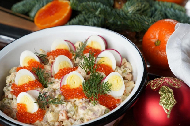Оливье с лососем и красной икрой