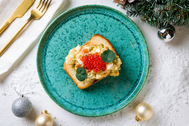 Вместо колбасы или говядины тут нежнейший слабосоленый лосось — вариант проверенный и надежный. А еще красная икра, придающая салату звонкости, а еще бриошь, на которую салат надо уложить, перед тем как съесть. Рецептом с нами поделилась Ксения Крылосова, владелица кофейни Tempo.