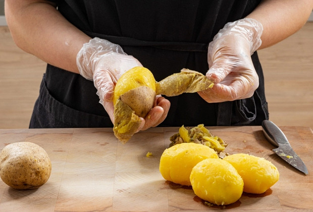 Готовому картофелю дайте немного остыть и очистите от кожуры. Важно, чтобы картофель при этом оставался горячим.