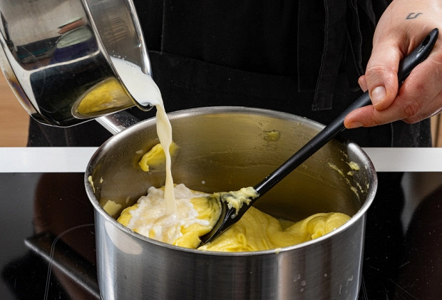 Когда пюре начнет приобретать более-менее плотные очертания, в него в несколько заходов нужно вмешать горячее молоко.