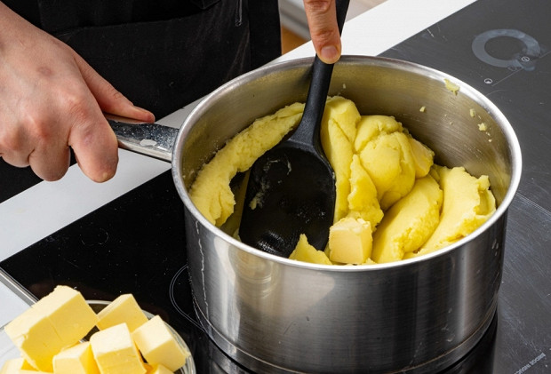 Подогревая пюре на небольшом огне, постепенно, по одному, добавляйте в него холодные кубики масла, постоянно перемешивая и перетирая пюре деревянной или силиконовой лопаткой и следя, чтобы масло смешивалось с картофелем, а не стекало вниз подтаявшей лужицей.