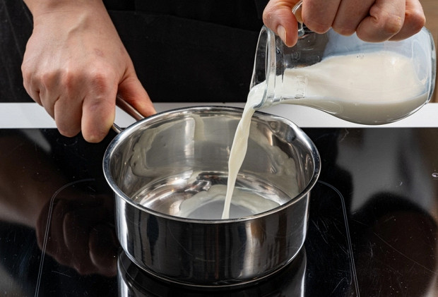 Переложите картофель в сотейник, в другом небольшом сотейнике подогрейте молоко почти до кипения.