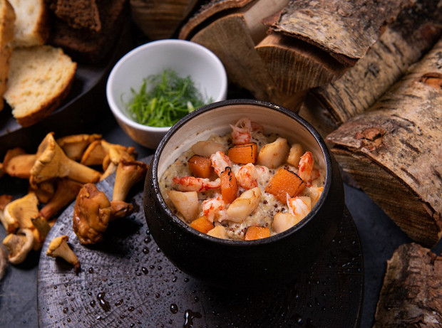 «Это легкая каша: нежная крупа, сваренная в топленом молоке, нежные раковые шейки и гребешок и тыква, дающая интересную сладость. Тыква, на мой взгляд, вообще универсальный продукт и легко складывается с основной массой продуктов. Но только, когда будете готовить эту кашу, ищите тыкву послаще. Я бы даже советовал сначала найти сладкую тыкву, а уже потом приступать к готовке».