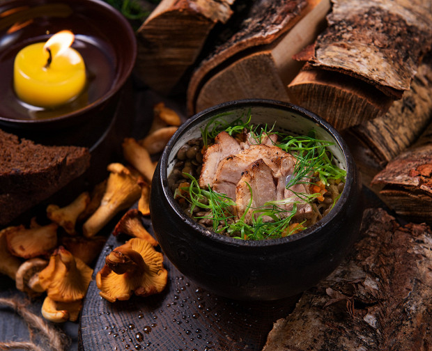 «Про чечевицу известно, что она всегда идеально складывается с копчеными продуктами, поэтому тут не пришлось ломать голову и придумывать ей соседство: мы добавили в кашу копченые свиные ребра, которые у нас есть в меню, как самостоятельное блюдо. Если готовить кашу дома, то это запросто могут быть готовые копчености, купленные на рынке или в магазине.