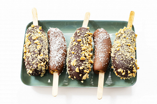 Еще один элементарный в приготовлении, но красивый десерт. Бананы для него надо брать крепкие, но спелые. Идеально подойдут мини-бананы: они выглядят симпатичнее. И запаситесь разными посыпками: тут хороши мелкие цукаты, кокосовая и миндальная крошка и специальные сахарные бусины, которые продаются на кондитерских сайтах.