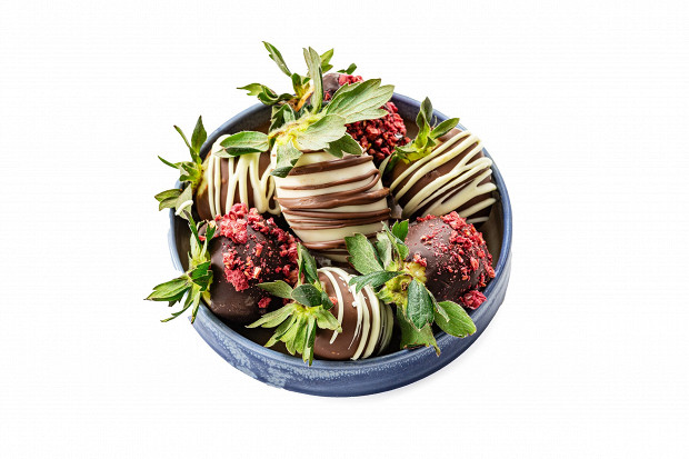 Все, что понадобится, — это две плитки шоколада, темного и белого, лукошко свежей клубники и микроволновка. Растопить шоколад в микроволновке — пара пустяков, дальше остается только окунуть в него ягоды: сначала в один, потом в другой, тогда на клубнике появится эффектный мраморный рисунок. В этом рецепте фигурирует сублимированная малина, ее легко купить на любом маркетплейсе, но при желании можно заменить на кокосовую стружку или миндальные лепестки: их найти еще проще.