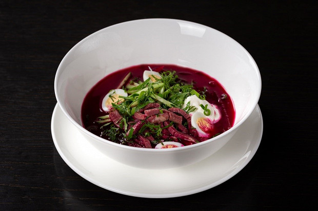 В свекольнике из «Кофемании» узнаваемый вкус супа сочетается с шелковистой текстурой пюре, этот эффект достигается за счет того, что часть свеклы после варки измельчается в блендере до однородности. В гущу супа внедряются солоновато-копченые кусочки пастрами, а оттенок копчености сладкой свекле всегда отлично подходит. В сумме — хороший вариант для обеда на веранде, легкий, но достаточно плотный. Подавать суп можно и холодным, и горячим. А если под рукой не найдется пастрами, его заменят грудинка или подкопченный бекон.