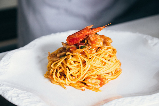Тальолини с соусом арраббьята, артишоками и красной сицилийской креветкой от Нино Грациано