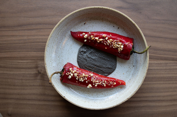 «Перец — важный для мексиканцев продукт. Мы решили добавить ему чуть сливочности, для чего нафаршировали его смесью из сыров и арахиса. А чтобы придать перцу копчености — в Мексике его часто готовят на огне — мы обжигаем его горелкой. Дома, если нет горелки, перец можно спокойно обжечь на сухой сковороде без масла. Мы используем сыры чеддер, пармезан и моцарелла. Два последних легко меняются на другие, схожие по текстуре сыры, а вот чеддер лучше оставить как есть — блюду важна и его плавкость, и его вкус».