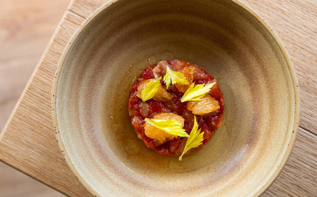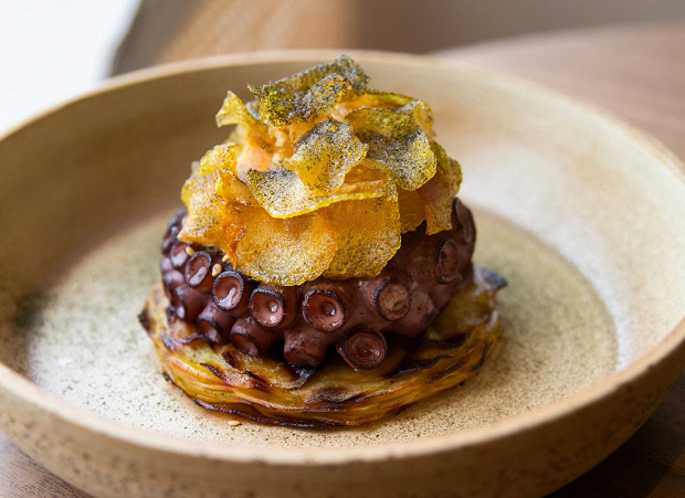 «Мы решили соединить море и землю Мексики, сложить два типичных ингредиента. Из картофеля мы делаем гратен — тонко нарезаем картошку, укладываем ее слоями и запекаем в духовке. С осьминогом чуть сложнее: его обязательно надо варить от часа до полутора с пряными травами. Сочетание картошки с осьминогом привычно для мексиканцев, тут мы просто сделали это блюдо чуть краше, добавив к нему луковый крем и томатную сальсу».