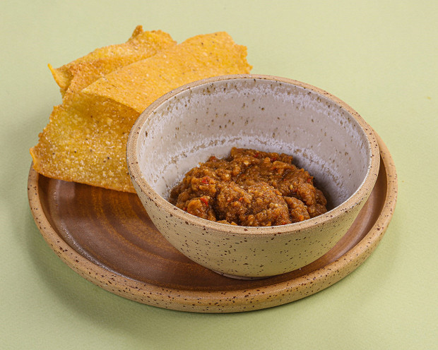 «Это национальная закуска, в которой мы чуть адаптировали ингредиенты, чтобы они были и доступней, и понятней в России. Вместо томатильо — это такой зеленый физалис, который распространен в Мексике, — мы используем крыжовник и привычный нам физалис, который можно найти в овощных лавках. Если вы будете готовить сальсу летом, берите свежий крыжовник; если в остальные времена года — спокойно замените его на замороженный. Есть сальсу можно просто так, окуная в нее кукурузные чипсы начос или всевозможные крекеры. Также можно подать ее к горячим блюдам, например к белой рыбе или стейку из говядины — она отлично освежает рецепторы».