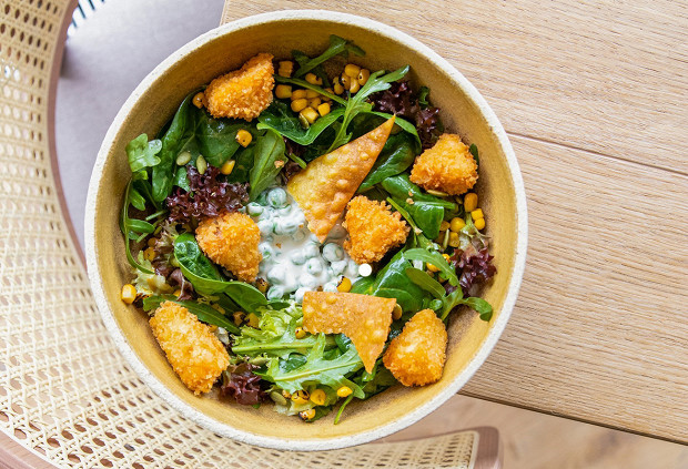 «Это дань традиции народа майя высаживать вместе тыкву, бобы и кукурузу. В этом рецепте к зеленому салатному миксу мы добавляем бланшированный зеленый горошек, заправляем все это трюфельной сметаной — просто соединяем обычную сметану с трюфельной пастой из банки. Следом туда отправляется сладкая хрустящая тыква, запанированная и обжаренная во фритюре. Ну и следом идут зерна кукурузы, опаленные горелкой или обжаренные на сухой сковороде. Подавать салат надо с чипсами начос — они усилят этот мексиканский дух».