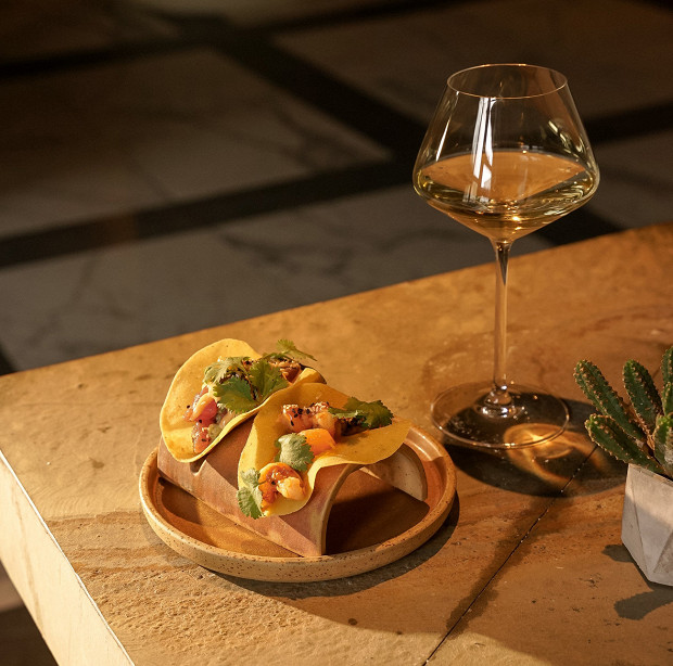 «Лепешку для тако, да и саму муку мы готовим сами — и это увлекательно и вкусно. Но дома лучше не ломать голову и купить готовую кукурузную лепешку — их можно найти в хлебных отделах больших супермаркетов. Что касается начинки: тут получилось интересное сочетание креветки, томата, мандаринов и батата, который мы доводим до состояния нежнейшего крема, соединив его со сливками и медом. В рецепте прописан соус лемонграсс, который можно найти в магазинах».