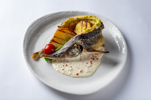 Красивая история о купеческих застольях, икорных россыпях и реках шампанского. Стерлядь всегда была рыбой дорогой и праздничной, которая сразу задавала накрытому столу торжественный тон. «Стерлядь кольчиком» (то есть свернутая в кольцо) была любимым блюдом ресторанов старой Москвы, о нем даже упоминает Чехов в своем самом гастрономическом рассказе «Сирена». С тем, что положить в «кольчик», мудрить не стоит: румяный картофель, зелень и красная икра — ничего лишнего.