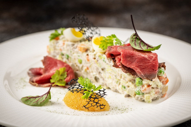 Оливье: с ростбифом, телятиной, перепелками и раковыми шейками