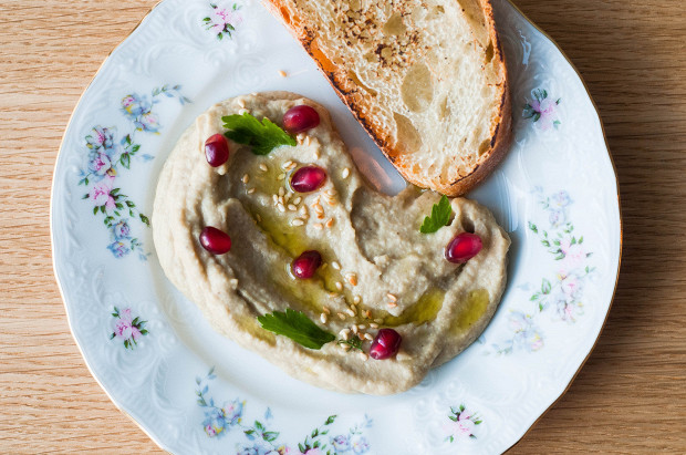 «Я очень люблю бабагануш, но здесь есть не только печеный баклажан, но и ялтинский лук. Вкус у баклажана, соединенного с нутом, довольно гладкий, мы его обогащаем за счет ароматного кунжутного масла. Еще баклажан на вкус довольно простой. Намазку можно усложнить за счет сельдереевого масла, оно придаст закуске свежести. Делается масло просто: листочки сельдерея бланшируются, потом из них выжимается сок, его мы добавляем в оливковое масло и настаиваем».
