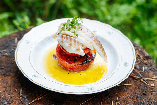 Фокус закуски от Алексея Каневского, шеф-повара ресторана Smoke BBQ, в том, что томаты нарезаются довольно толстыми кружочками и быстро обжариваются в смеси соли и сахара, от чего приобретают карамельную сладость. С рыбой тоже происходит волшебное: стоит слегка подержать ее в соли, которая вытягивает влагу, и хрупкое филе сибаса становится плотнее, концентрирует вкус и отлично держит форму. Такое канапе можно есть даже руками, не опасаясь, что в самый ответственный момент оно развалится и брызнет на рубашку томатным соком.