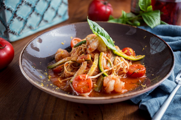 Любая паста не обходится без томатного соуса. Они так же неразделимы, как Тоскана и бароло, Пьемонт и трюфель, Милан и высокая мода. Тициано Казилло, бренд-шеф кафе Scrocchiarella, предлагает рецепт пасты в цветах итальянского флага: белые лингвини, красные томаты и пунцовые креветки, зеленый базилик. Просто и со вкусом. Стоит готовить такое почаще, чтобы не забывать, какая она на вкус — итальянская классика.