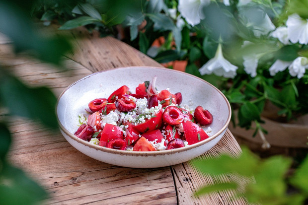 Ярчайший салат от Александра Семенова, шеф-повара ресторана Maer, можно смело назвать «Битва за урожай». Черешня, помидоры и красный лук накиданы щедрой рукой. Еще в салате задействован национальный чеченский творог калд: именно его солоноватый вкус организует хаос на тарелке. В сумме — невероятно чувственная еда, расцвеченная всеми красками южного лета. При желании калд легко заменить крупчатым домашним сыром или хорошо отжатым подсоленным обычным творогом, черешню лучше добавлять узбекскую, а лук — ялтинский, он самый сладкий.