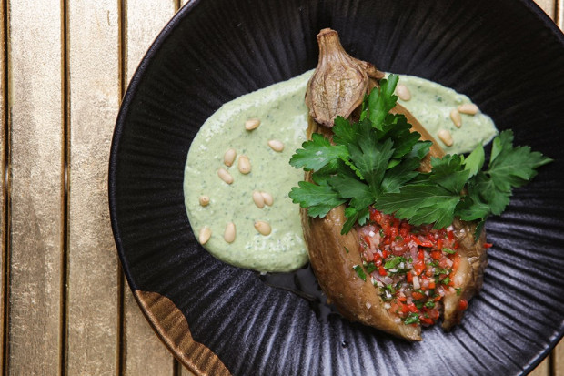 В свое время ставить кухню в модный московский Hydra Bar пригласили израильского повара Александра Марона. И он придал барной кухне тель-авивской разнузданности: печеный баклажан раскрывает на тарелке шелковистое нутро, в нем для контраста виднеется помидорная сальса, сдобренная изрядной дозой чеснока. Чтобы поставить финальную точку, нужно обзавестись хорошего качества соусом тхина и смешать его с целым ворохом зелени. Терпкая тхина, похожая на несладкую кунжутную халву, прекрасно сосуществует с любыми овощами — и свежими, и запеченными.