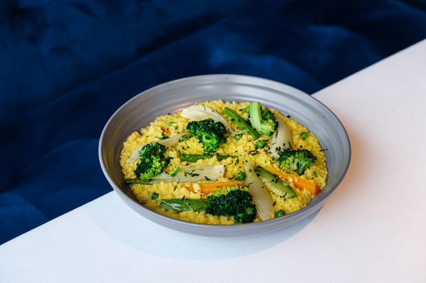 Кускусу не требуется долгое заваривание, в этом рецепте его приводят в кондицию с помощью овощного бульона, подкрашенного шафраном. Рецепт из ресторана «Магадан».