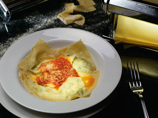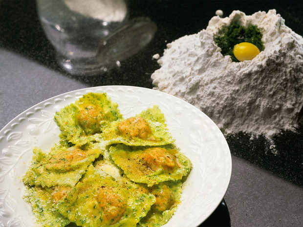 Со шпинатом в тесте не нужно перебарщивать. Равиоли должны быть слегка зеленоваты, а не изумрудно-зелены.