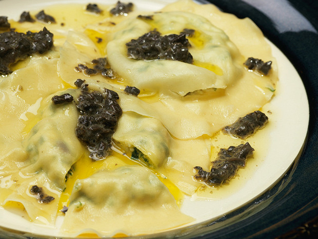 В качестве соуса можно сделать трюфельный соус: растопить сто грамм сливочного масла и добавить одну столовую ложку трюфельной пасты. Соуса наливают много — хорошо, если равиоли плавают в нем, но не тонут. То есть слишком много тоже не нужно.