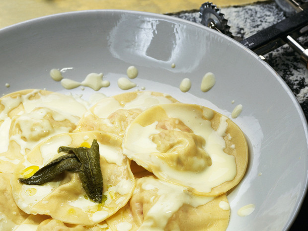 Особый смак в подаче больших равиоли — когда они не помещаются толком в глубокой тарелке.