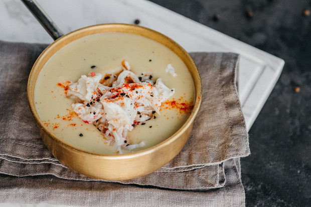 Прежде чем начать варить картошку, нужно заняться крабовым соусом: сначала обжечь хитин в духовке, а затем еще какое-то время выпаривать соус на тихом огне. Пюре, крабы и соус встречаются уже в тарелке.