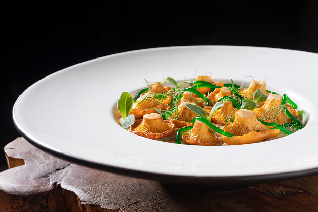 Рецепт от Андрея Колодяжного, приверженца гастроботаники и мастера сложных растительных построений. Но тут игра идет на простом и ярком сравнении упругих лисичек, воздушного картофельного пюре с изрядной дозой сливок и тонких завитков сельдерея.