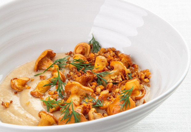 Блюдо составлено почти по коктейльной формуле, любимой Джеймсом Бондом, — «взболтать, но не смешивать». Отварной картофель размят и взболтан в блендере с крепким мясным бульоном и сливками до состояния глянцевого крема. Лисички обжарены отдельно и высыпаны сверху, напоминая румяный попкорн. Вид тарелки вызывает какие-то кондитерские ассоциации, но изрядная доза укропа возвращает к реальности. Рецепт предоставлен службой ресторанной доставки Gallery to Go.