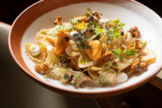 Соревнование в нежности между командой лисичек и мелкими соцветиями цветной капусты, даже внешне похожих. На макаронах-бабочках эти крошки смотрятся особенно трогательно. Так, что их хочется спасти и немедленно отправить в рот, прихватив по дороге ложку густого душистого соуса, приправленного перцем, тимьяном и чесноком. Создавая это несложное блюдо для винного гастробара Blush Wine Bar, Андрей Колодяжный самым внимательным образом относится к исходным продуктам и демонстрирует врожденное чувство композиции.